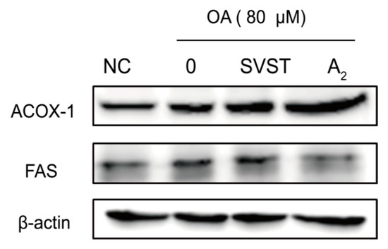 The relative expression of proteins related to fatty acid metabolism. NC, blank control without oleic acid; 0, model group with 80 μM oleic acid; SVST, group with 80 μM oleic acid and 10 μM simvastain; A2, group with 80 μM oleic acid and 10 μM oleiferasapoin A2; ACOX-1, fatty acid oxidation protein; FAS, fatty acid synthesis protein; β-actin, reference protein.