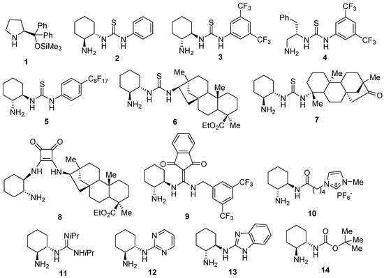 Different bifunctional primary amine-bearing organocatalysts are suitable to an additional coordination to the carbonyl group of the maleimide via hydrogen bonds, and are frequently prepared from chiral trans-cyclohexa-1,2-diamines. Taking into consideration this enamine-forming approach, these organocatalysts have been applied to the enantioselective Michael addition of aldehydes to maleimides, giving good enantioselectivities of the corresponding succinimides (Figure 1). Thus, the primary amine-thioureas 2 [16], 3 [17,18], 4 [19], and 5 [20], the beyerane-containing thiourea 6 [21], the isosteviol-derived thiourea 7 [22], the squaramide 8 [23], and even the calixarene-based thioureas [24,25], have been successfully employed. In addition, primary amino acid derivatives [26,27] and dipeptides have also been used [28], as well as a combination of Cinchona alkaloid-derived thioureas and primary amino acids [29] or Cinchona alkaloid-derived primary amines [30]. Other bifunctional primary amine-containing compounds used as organocatalysts in this transformation have been the diaminomethyleneindenedione derivative 9 [31], the ionic liquid-supported amide 10 [32], the guanidine 11 [33,34], the 2-aminopyrimidine 12 [35], the 2-benzimidazole 13 [36], the carbamate 14 [37,38,39], and the polymer-supported sulfonamides [40]. Even the simple non-derivatized chiral trans-cyclohexa-1,2-diamines have been used as organocatalysts [41].