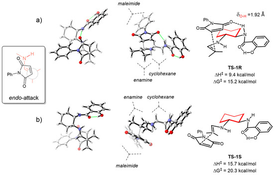 To acquire further insight into the origin of the enantioselectivity, we carried out theoretical calculations on the reaction between isobutyraldehyde 16a and maleimide 17a in the presence of organocatalyst 15. According to our previous computational results on a related process [38], the reaction proceeds by the formation of an enamine, followed by an attack to the electrophilic maleimide substrate through an endo transition state (Figure 4). We also considered the possible exo approach, but the higher activation energies were sufficient enough to discard its participation in the process. In this situation, the two faces of the enamine were clearly differentiated. If the approach of the maleimide occurred through the upper face (from our view), as it did in TS-1R, an efficient H-bond between the C=O group of maleimide and the NH group of the catalyst was formed. This activated the electrophile and induced a low activation barrier (15.2 kcal/mol) for the formation of the R product. If the approach of the two reactants was occurring from the other face, as it was in TS-1S, the carbonyl and NH moieties were far enough to avoid the formation of any effective H-bond, and the activation energy could not be lowered, resulting in a value of 20.3 kcal/mol. Thus, the high energy difference of the two transition states nicely explained the formation of the experimental major (R)-18aa isomer.