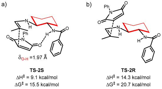 Meanwhile, the diastereomeric transition states for the reaction organocatalyzed by 19 were also computed. As mentioned before, catalyst 19 lacked the phenolic OH group, and showed similar reactivity and moderately lower enantioselectivity under similar conditions as catalyst 15 (Table 1, entries 1 and 8). Interestingly, the optimal transition states for 19 were located (TS-2S and TS-2R, Figure 5) and showed quite similar activation parameters as catalyst 15, although with enough differences to explain a moderate decrease in the enantioselectivity. For example, the Gibbs Free activation barriers leading to the two enantiomers were almost equivalent (15.2 vs 15.5 kcal/mol and 20.3 vs 20.7 kcal/mol), but the activation enthalpy difference between TS-1R and TS-1S was 6.3 kcal/mol, while the same value for TS-2S vs TS-2R was 5.2 kcal/mol. Thus, the presence of the OH induced a slight increase in the enthalpy gap between the two faces of the maleimide. Also, the critical H-bonding distances differed slightly, being shorter for TS-1R than for TS-2S (compare δO-H in Figure 4 and Figure 5). Thus, these data indicated that the H-bonding activation of the maleimide was optimal when the phenolic OH was present, lowering the enthalpy barrier in TS-1R the effects helped to increase the enantioselectivity observed when organocatalyst 15 was employed, rigidifying the NH-CO-Ar benzamide system, which reduced the conformational variability of catalyst 19.
