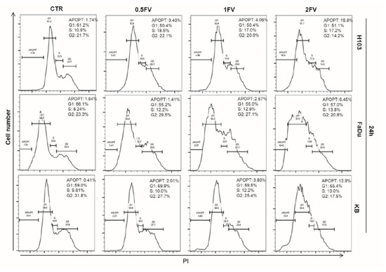 Impact of fucoidan on cell cycle distribution of HNSCC cell lines: H103, FaDu, KB. Cell cycle analysis after incubation with different concentrations of fucoidan for 24 h. Increasing dose of fucoidan increases the number of apoptotic cells in all tested cell lines. Treatment with fucoidan induces G2/S arrest in H103 and FaDu cells, and G1 arrest in KB cell line. (CTR—control, 0.5FV—half-fold of IC50 concentration, 1FV—IC50 concentration, 2FV—2-fold of IC50 concentration, PI—propidium iodide).
