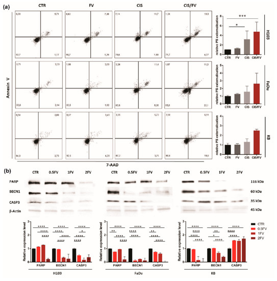 Impact of fucoidan on the induction of apoptosis in HNSCC cell lines: H103, FaDu, KB (a): 24 h incubation with fucoidan induces apoptosis in all tested cell lines (CTR—control, 0.5FV—half-fold of IC50 concentration, 1FV—IC50 concentration, 2FV—2-fold of IC50 concentration, PS—phosphatidylserine). The data are presented as an average ± standard deviation. (b): 24 h treatment with fucoidan down-regulates the levels of full-length PARP, BECN1, and CASP3 in H103 and FaDu cells. Fucoidan decreases the expression of PARP and BECN1 while up-regulating levels of CASP3 in KB cell line. (CTR—control, 0.5FV—half-fold of IC50 concentration, 1FV—IC50 concentration, 2FV—2-fold of IC50 concentration). The data are presented as mean ± standard deviation. p values lower than 0.05 were considered significant and are labeled by asterisks (*) for p < 0.05, (**) for p < 0.01, (***) for p < 0.001, and (****) for p ≤ 0.0001.