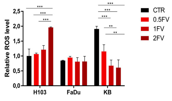 Flow cytometric analysis revealed FV-induced externalization of phosphatidylserine in all HNSCC cell lines. The effect was dose-dependent, and the most sensitive cell line was H103 (Figure 3a). Additionally, induction of apoptosis was confirmed by Western blot, which revealed a down-regulation in the full-length forms of PARP and CASP3 in H103 and FaDu following 24 h treatment with FV. The effects observed in KB cells differ regarding CASP3, in this case, fucoidan treatment correlated with up-regulated expression (Figure 3b). Additionally, in all tested cell lines, the down-regulation of BECN1 (an anti-apoptotic marker) was observed, which indicates direct caspase-dependent apoptosis is occurring. Furthermore, 24 h treatment with fucoidan increased ROS production in H103 cells. In contrast, an opposite effect was observed in KB cells, where incubation with fucoidan reduced ROS production. Both effects were dose-dependent. However, FaDu cells remained unresponsive to fucoidan, as ROS production was not altered after treatment, which suggests that cell death was not related to oxidative stress but rather to direct activation of caspase-dependent apoptosis (Figure 4).