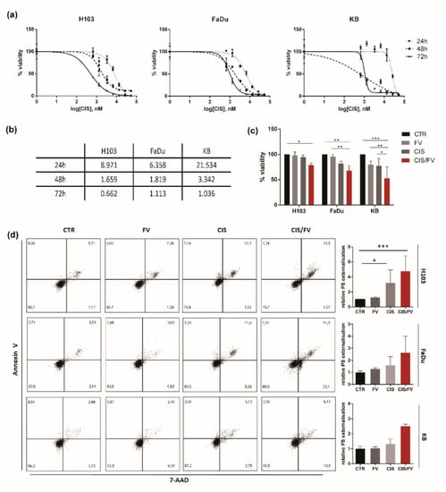 Simultaneous co-administration of cisplatin and fucoidan on HNSCC cell lines: H103, FaDu, KB. (a) Survival curves of HNSCC cells generated after exposure to cisplatin for 24, 48 and 72 h. (b): IC50 doses after 24, 48 and 72 h incubation with cisplatin in µM. (c) Fucoidan enhances the response to cisplatin by further decreasing the proliferation of all tested cell lines after 8 h incubation (H103) and 16 h (FaDu, KB) at the IC50 concentrations. The data are presented as mean ± standard deviation. (d) Fucoidan enhances the response to cisplatin by further inducing apoptosis of all tested cell lines after 8 h incubation (H103) and 16 h (FaDu, KB) at the IC50 concentrations. CTR—control, CIS—cisplatin, CIS/FV—cisplatin and fucoidan, PS—phosphatidylserine). p values lower than 0.05 were considered significant and are labelled by asterisks (*) for p < 0.05, (**) for p < 0.01, (***) for p < 0.001, and (****) for p ≤ 0.0001.