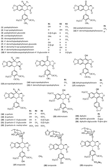 Chemical structures of lignans and podophyllotoxin derivatives [13,25].