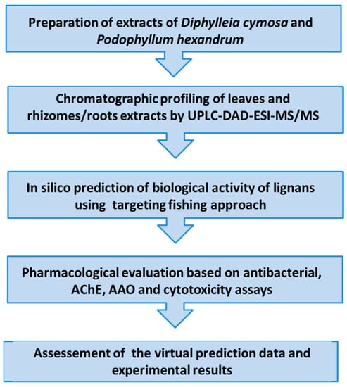This paper reports on the evaluation of ethanolic extracts from the leaves and roots of D. cymosa, and from the rhizomes and roots of P. hexandrum for the antibacterial activity, inhibition of AChE, as well as for the antioxidant activity and cytotoxicity combined with an in silico target fishing approach. The latter was used to predict new activities for known lignans from both species. The lignans profiling was based on the chromatographic analyses (UPLC-DAD-ESI-MS/MS) which were included with the aim of identifying the major phenolic components in the extracts (Figure 2).