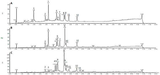 Chromatographic profiles obtained by UPLC-DAD for the EtOH extracts of D. cymosa leaves (A) and roots (B) and P. hexandrum rhizomes and roots (C).
