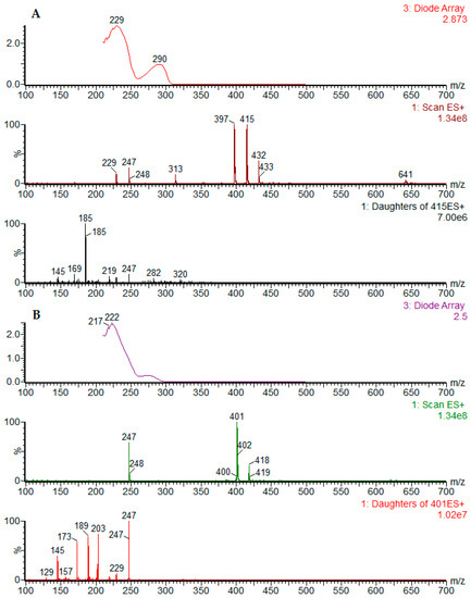 In this study, the chemical characterization of D. cymosa and P. hexandrum was performed using UPLC-DAD-ESI-MS. The obtained chromatographic profiles indicated the presence of compounds of different polarities in the EtOH extracts of D. cymosa and P. hexandrum (Figure 3). The crude extracts as well as lignans previously isolated from P. hexandrum such as PTOX (1), deoxypodophyllotoxin (5), 4′-demethylpodophyllotoxin (6), podophyllotoxone (11), α-peltatin (18) and β-peltatin (19) were evaluated in the same chromatographic conditions. The UV and ESI+-MS spectra for the reference compounds podophyllotoxin (1) and α-peltatin (18) are presented in Figure 4 (Figure 4A,B). The UV and MS spectra for all reference compounds and identified chromatographic peaks are available in the Supplementary Material.