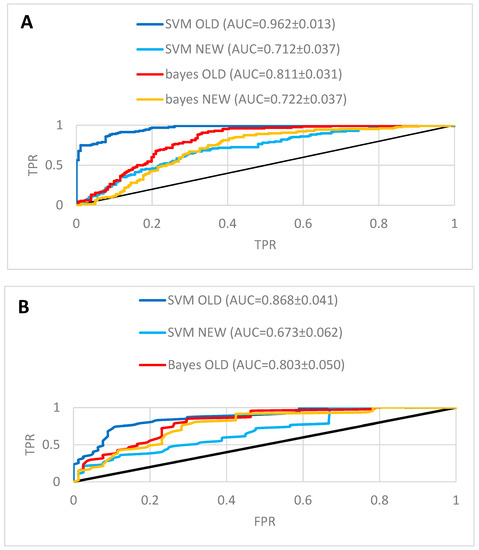 Therefore, we decided the best approach for validation was to re-build all of these 243 models, excluding the lignans that appear in each dataset and repeat the prediction. The details of all these models, as well as their internal validation are included in the Supplementary Material (Table S3). The calculated values Pa-Pi of lignans that were excluded from the models are shown in Table S4 of the Supplementary Material. As expected the prediction was a little worse, but the results are still very good, considering most datasets have a cell-based format, with an AUC of 0.71 for SVM and 0.73 for Naïve Bayes (Figure 5A and Table 2). It is worth pointing out that while the SVM method experienced a large decrease in AUC (0.25 AUC units) the Naïve Bayes had a far smaller decrease (0.09 AUC units). This is an evidence that the Naïve Bayes method has a smaller dependence from the input and is less unresponsive to small variations of the dataset composition. The SVM has a lower resilience as it is much more dependent on the input dataset.