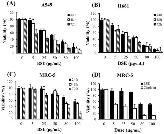 Effects of treatment concentration and duration of BSE on the proliferation of (A) lung cancer A549 cells, (B) H661 cells, (C) lung fibroblast MRC-5 normal cells, (D) the comparison of the effects of BSE and cisplatin on MRC-5 cells under 48 h treatment.