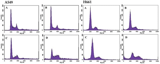 Cell cycle analysis of A549 and H661 cells treated with different concentrations of BSE by flow cytometry. The cells (1 × 106 cells) were incubated with: (A) 0 μg/mL (Control), (B) 22 μg/mL, (C) 44 μg/mL, (D) 88 μg/mL of BSE for 48 h. The percentage of each phase was analyzed by WinMDI 2.5 software.