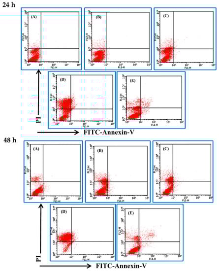 Effects of BSE on H661 cell death pattern under the treatment of different durations (24 and 48 h) and different concentrations of BSE: (A) 0 μg/mL (Control), (B) 22 μg/mL, (C) 44 μg/mL, (D) 88 μg/mL, (E) Cisplatin in 100 μg/mL. Lower left (LL) quadrant: viable cells; upper left (UL) quadrant: necrotic cells; lower right (LR) quadrant: early apoptotic cells; upper right (UR) quadrant: late apoptotic cells.