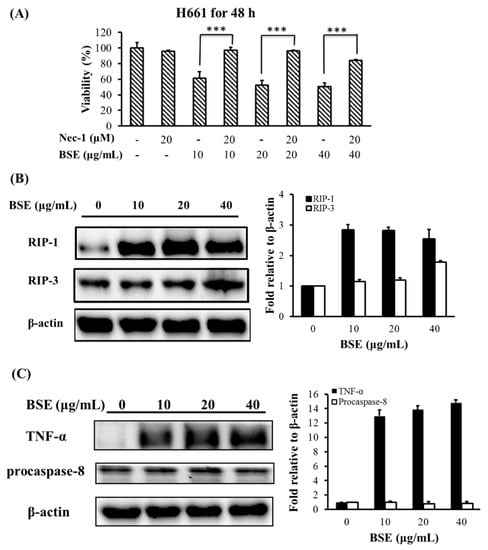 Necroptosis could be induced by stimulating death receptors with agonists such as TNF-α, FasL, and TRAIL [5,41]. TNF-α stimulation can transduce necroptosis signal in the absence of caspase-8 activity [43]. Figure 5C shows that TNF-α was highly expressed when H661 cells were treated with 10 to 40 μg/mL of BSE. Moreover, the protein level of procaspase-8 had no significant change under BSE treatment. Accordingly, these results indicate that the necroptosis might be stimulated by TNF-α in the absence of caspase-8 activity.