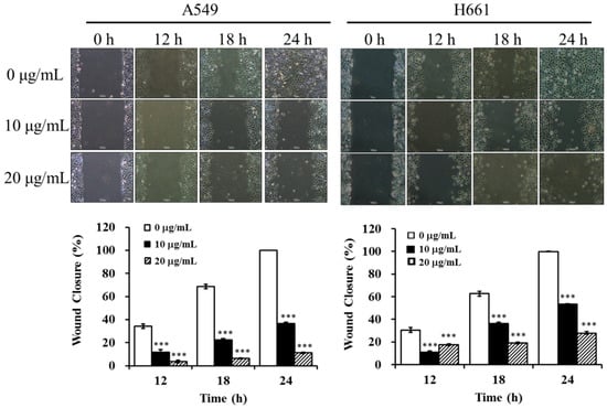 Effect of BSE on A549 and H661 cell migration by wound healing assay. A549 and H661 were seeded into culture dishes and grown to 90% confluence in 6 cm dishes. The cells were scratched with a sterile tip, BSE (0, 10 and 20 μg/mL) were added and the wounded area were photographed at 0, 12, 18 and 24 h. The inhibitory effect on cell migration is expressed as the level of wound closure. A significant difference from the vehicle was indicated as *** p < 0.001 (Student’s t-test).
