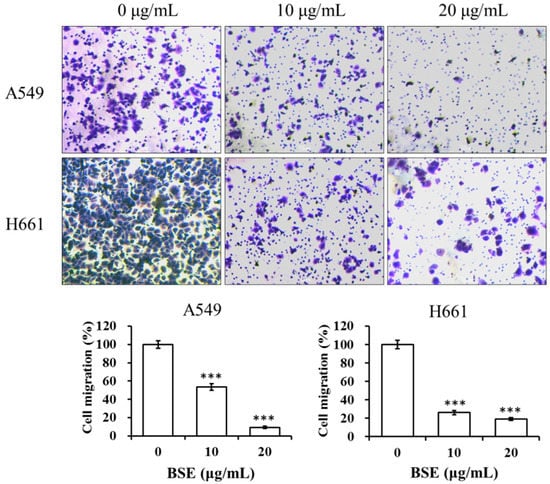 Effect of BSE on A549 and H661 cell migration by transwell assay. An aliquot of 2 × 105 cells of A549 and H661, respectively, were seeded onto the upper chamber in serum-free medium with BSE (0, 10 and 20 μg/mL) for 24 h. The cells migrated through polycarbonate membrane were stained with crystal violet and photographed. The crystal violet-stained cells were calculated. A significant difference from the vehicle was indicated as *** p < 0.001 (Student’s t-test).