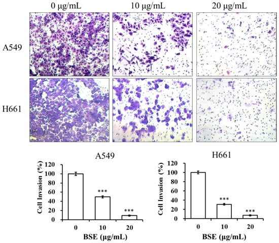 Effect of BSE on A549 and H661 cell invasion. A BD BioCoatTM MatrigelTM invasion chamber was used for invasion assay. An aliquot of 2 × 105 cells of A549 and H661, respectively, were seeded onto the upper chamber in serum-free medium with BSE (0, 10 and 20 μg/mL) for 24 h. The cells invaded through Matrigel were stained with crystal violet and photographed. The crystal violet-stained cells were calculated. A significant difference from the vehicle was indicated *** p < 0.001 (Student’s t-test).