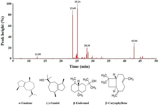 The gas chromatography-mass spectrometry (GC-MS) analytical results show that BSE contains at least 25 ingredients (Figure 9), of which 10 compounds were identified using the NIST spectral database of the mass spectrometry. The main constituents of BSE were identified as α-guaiene (relative content RC = 34.0%; retention time RT = 25.21 min), (−)-guaiol (RC = 28.7%; RT = 23.69 min), (−)-nortrachelogenin (RC = 8.3%; RT = 43.04 min), β-eudesmol (RC = 6.4%; RT = 28.20 min) and β-caryophyllene (RC = 1.4%; RT = 12.55 min). The identities of α-guaiene, (−)-guaiol, β-eudesmol and β-caryophyllene were further confirmed by comparing their mass spectral data with the analytical results from the commercially available products, while (−)-nortrachelogenin was commercially unavailable.