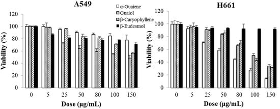 Cytotoxicities of α-guaiene, (−)-guaiol, β-caryophyllene and β-eudesmol on A549 and H661 cells for 48 h treatment.