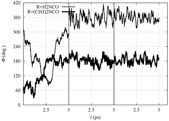 Car–Parrinello molecular dynamics (CP–MD) simulations [24,25] were performed for models with R = H2N, (CH3)HN and (CH3)2N, starting from the final atomic positions and velocities obtained with the corresponding DFTB model at T = 300 K. The parallel version of the Quantum-Espresso package [39], which incorporates Vanderbilt ultra-soft pseudopotentials [40] and the PBE exchange-correlation functional [23], was used in all CP–MD simulations. Electronic wave functions were expanded in plane waves up to an energy cutoff of 25 Ry, while a 250 Ry cutoff was used for the expansion of the augmented charge density in the proximity of the atoms, as required in the ultra-soft pseudopotential scheme. As in the DFTB calculations, periodic boundary conditions were applied in the three directions of space. All calculations were performed under spin-restricted conditions, i.e., with two-electrons effective Kohn–Sham orbitals. The electronic ground state was first calculated using 10 steps of conjugate gradient minimization performed on the dynamic variables representing electrons. Then, the system evolution was followed with CP–MD, using as initial velocities those obtained with the final DFTB configuration. As in the DFTB BO–MD, we used the velocity-Verlet algorithm for integrating the equations of motion, with a time step of 0.121 fs. Empirical dispersive corrections of energy and forces [41,42] were included in the CP–MD simulations to correct for the overestimate of atomic repulsion by the DFT approximation.