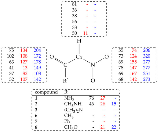 Despite the absence of stable intramolecular hydrogen bonds, there are significant intramolecular interactions in certain compounds. For instance, there is a high persistence of the intramolecular interaction between the N–O bond and the amide H atom when R = NH2CO (1). This interaction keeps the aci form sealed in the E conformation, the latter more hindered to water access than the aci form of other compounds (see Table 3 and Figure 4 discussed below). The N–O⋯H–N interaction displays an angle smaller than 135, thus being not classified as an hydrogen bond, but rather a strong electrostatic interaction. The proton attached to the nitro group in the aci form when R = NH2CO never interacts with N and O of the amide group. The latter atom is always anti to the nitro group with respect to C-C bond. As a consequence of this closed aci form, the anion displays always the strong N–O⋯H–N intramolecular electrostatic interaction, while such interaction is not effective in the other substituents.