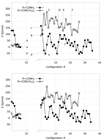 Here, n indicates the water molecules in the solvation layer of the N solute, while the number of water molecules in the layer when the nitronate anion N− is formed. The energy change due to the addition or deletion of x water molecules (x can be a negative number) to the solvation layer is determined by calculating in one single conformation of R = CONH2 the energy change to increase the size of the layer from 16 to 30 water molecules. The cohesion energy of a single water molecule to the layer is therefore approximated as: