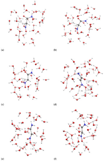 Structures of samples with R = H2NCO along with proton extraction (Figure 5). Panels (a–f) refer, respectively, to points indicated with a–f in Figure 5. C is gray, N is blue, O is red, H is white. Atomic and bond radii are arbitrary. Some relevant distances are displayed. Explicit bonds are drawn when atoms are closer than 1.6 Å. The VMD [31] program is used for all molecular drawings.
