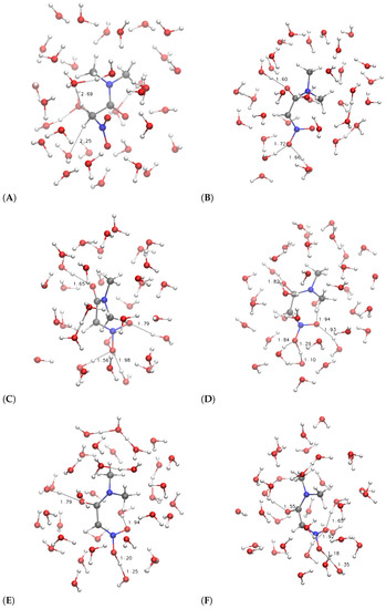 On the other hand, the more hydrophobic substituent (R = (CH3)2NCO, 3, circles in Figure 5) displays a fast movement of H to the closest water molecule (2.7 Å compared to 2.0 of 1), with a similar increase in potential energy compared to 1. However, the following relaxation of the charge separation (Figure 7C) does not allow a significant decrease in potential energy. The excess proton (that is visible in panel C on top of the carbonyl group) displays a high energy and the movement of the excess proton away from the first solvation layer does not produce a significant decrease in potential energy (Figure 7D). The oscillation of potential energy (panels e–f and E–F of Figure 6 and Figure 7, respectively) does not allow for the hydrophobic substituent (circles in Figure 5) the dissipation of potential energy that is allowed for the more hydrophilic one (filled circles in the same figure).