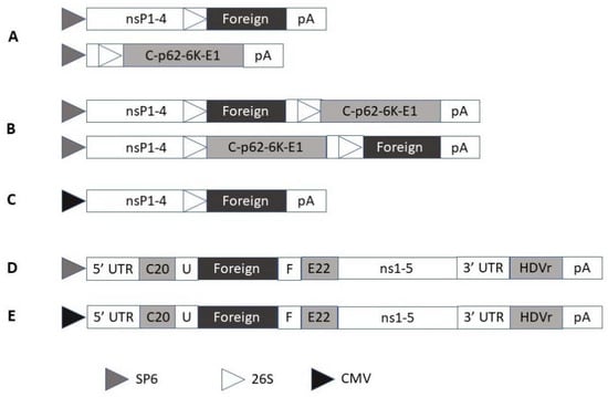 Alphaviruses belong to the family of Togaviridiae []. The most common alphaviruses engineered as expression vectors are based on Semliki Forest virus (SFV) [], Sindbis virus (SIN) [], and Venezuelan equine encephalitis virus (VEE) []. The alphavirus genome consists of four nonstructural genes (nsP1–4), responsible for RNA self-replication and the genes for the capsid and envelope proteins [] (Figure 1A–C). Engineered alphavirus vectors generate replication-deficient and -proficient recombinant particles suitable for transgene expression in cell lines and in vivo []. Introduction of a CMV promoter upstream of the nsP genes allows direct transfection of plasmid DNA with self-replicating RNA capacity []. Due to the design of these alternative alphavirus vectors it is possible to conduct studies with naked RNA replicons, recombinant viral particles and layered DNA–RNA vectors.