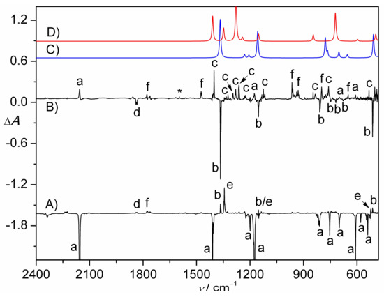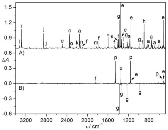 The IR spectrum of the flash vacuum pyrolysis (700 K) products of CHCl2S(O)2N3 is depicted in Figure 4A. Traces of the azide survive, SO2, HCN, HCl, CO, HNSO, OCCl2 (m, 1817.9, 847.2 and 843.6 cm−1) [40], ClCN (k, 2208.0 cm−1) [41], •NSO2 (g, 1376.7, 1345.0, 1229.3 and 936.6 cm−1) [27], HNSO2 (l, 3329.6, 1387.9, 1300.3, and 672.1 cm−1) [26], and •CHCl2 (h, 1223.3 and 896.2 cm−1) [42] can be identified among the pyrolysis products. The identification of •NSO2 can be ascertained with the subsequent photoisomerization with OSNO• upon further UV-light irradiation (Figure 4B).