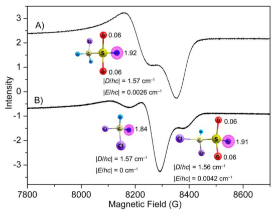 In line with the IR spectroscopic observation of SO2-elimination during the photolysis of CHCl2S(O)2N3, a second triplet nitrene signal with ZFSP of |D/hc| = 1.57 cm−1 and |E/hc| = 0 cm−1 for dichloromethylnitrene CHCl2N was also observed in the EPR spectrum (Figure 5B). Its assignment is supported by the close similarity with other alkyl nitrenes such as CH3N (|D/hc| = 1.720 cm−1 and |E/hc| < 0.003 cm−1) [49] and CF3N (|D/hc| = 1.741 cm−1 and |E/hc| = 0 cm−1) [12]. In contrast, no EPR signal for chloromethylnitrene CH2ClN could be observed in the photolysis of CH2ClS(O)2N3, which is probably due to immediate isomerization to singlet species (CHCl=NH) under the photolysis conditions.