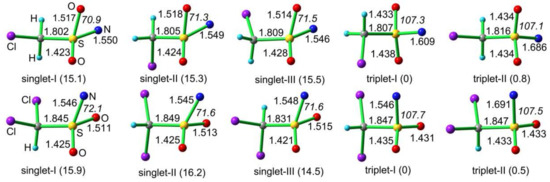 The calculated molecular structures and relative energies of CH2ClS(O)2N and CHCl2S(O)2N in the singlet and triplet states are depicted in Figure 7. For each nitrene in the singlet state, three rotamers differing in the staggered orientation of the methyl group with respect to the SO2N moiety are close-in-energy minima. Consistent with the IR and EPR spectroscopic observations, both sulfonyl nitrenes prefer triplet ground state, and the singlet state are about 15 kcal mol−1 higher in energy at the B3LYP/6-311++G(3df,3pd) level. The energy gaps between the singlet and triplet states (ΔEST) for CH2ClS(O)2N (15.1 kcal mol−1) and CHCl2S(O)2N (14.5 kcal mol−1) are close to those of CH3S(O)2N (13.6 kcal mol−1) and PhS(O)2N (14.7 kcal mol−1) at the same theoretical level [31].