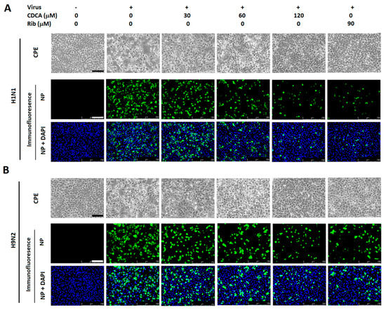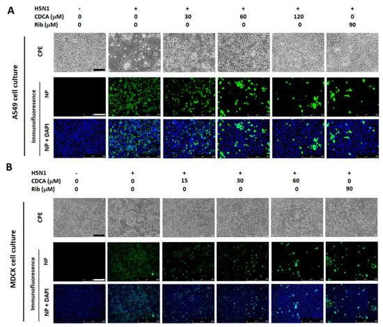 Next, we examined the protective effects of CDCA on A549 and MDCK cells from highly pathogenic H5N1 virus infection via observing cytopathic effect (CPE) and virus distribution profile reflected by viral nucleoprotein (NP) expression using immunofluorescence microscopy at 48 hpi. As shown in Figure 2A,B, H5N1 replication was significantly inhibited and cells were protected by CDCA in a dose-dependent manner. Ribavirin, a well-known inhibitor of viral RNA synthesis [], was used as a positive antiviral drug control in this study. Our results showed that 90 μM of ribavirin exhibited a significant inhibition on H5N1 infection in the same assays.