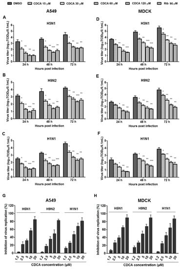 CDCA reduced progeny influenza A virus (IAV) yield in A549 and MDCK cell cultures. A549 or MDCK cells grown in 24-well plates were infected with influenza virus H5N1 (0.1 MOI) for 1 h, or H9N2 (0.5 MOI) or PR8 (H1N1) (0.5 MOI) for 2 h, respectively, and then cultured in fresh medium containing various concentrations of CDCA. At indicated timepoints postinfection, cells and supernatants were collected and subjected to viral titer determination using the end point dilution assay. Virus titer was expressed as log10 TCID50/0.1 mL. (A–C) CDCA inhibited replication of H5N1, H9N2, and H1N1 viruses in A549 cell cultures, respectively. (D–F) CDCA inhibited replication of H5N1, H9N2, and H1N1 viruses in MDCK cell cultures, respectively. Data are presented as mean ± SD of results from three independent experiments. * p < 0.05, ** p < 0.01 and *** p < 0.001 compared to the respective virus control (represented with DMSO). (G,H) CDCA reduced IAV progeny yield in a dose-dependent manner at 48 hpi. The percent inhibition of virus replication was calculated as a ratio of reduced virus titer from a CDCA-treated sample (compared with the DMSO control) to virus titer from the DMSO control.