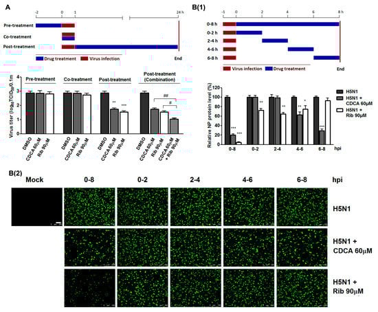 CDCA inhibited H5N1 replication by targeting the later stage of the virus lifecycle. (A) Time course inhibition assay. A549 cells grown in 24-well plates were treated with CDCA or ribavirin or their combination for 2 h prior to virus infection (pretreatment), for 1 h during the viral adsorption period (cotreatment), or for 24 h after 1 h virus infection and removal (post-treatment). For three treatment models, 0.1 MOI of H5N1 was used for infecting cells for 1 h. At 24 hpi, supernatants were collected for determining virus titer using the end point dilution assay. Upper panel: the experimental design. Lower panel: virus titers from three independent experiments. (B) Time-of-addition assay. A549 cells grown in 24-well plates were infected with 1.0 MOI of H5N1 for 1 h. After two washes with PBS, 60 µM of CDCA or ribavirin was added at the indicated times and removed after 2 h or 8 h. After each incubation period, the cells were incubated with fresh medium until 8 hpi. The cells were then subjected to viral NP protein analysis using IFA. The experimental design was shown in the upper panel (B1). Results shown in the lower panel (B1) are normalized NP protein levels based on the fluorescence optical densities (OD) of the images from three independent experiments. Software Image J was used to digitize image OD; results from CDCA or ribavirin treated samples were compared to those from corresponding DMSO-treated control groups (set as 100%). Representative IFA images of the three independent experiments are shown in the B2 panel. Scale bar: 125 µm. Statistical significances are denoted by * p < 0.05, ** p < 0.01, and *** p < 0.001 compared to DMSO control, and # p < 0.05 and ## p < 0.01 between indicated groups.