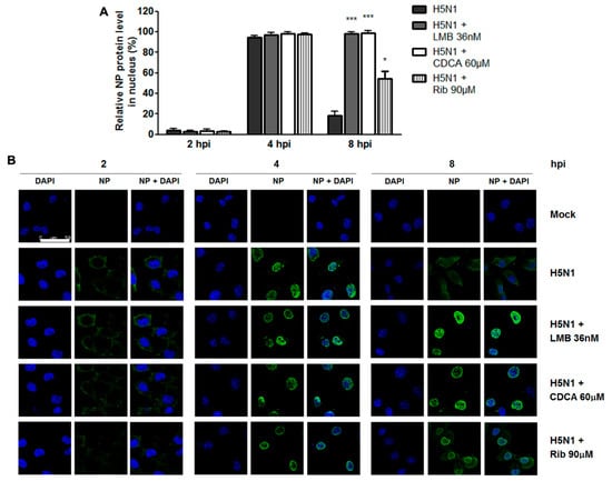 During IAV infection, the nuclear export of viral ribonucleoproteins (vRNPs) is required for the final assembly of progeny virions before their release from the infected host cell []. To investigate the effect of CDCA on IAV RNP nuclear export, we observed the dynamic change of H5N1 RNP in the cytoplasm and nucleus (reflected by NP staining) in the presence or absence of CDCA between 0 to 8 hpi. As shown in Figure 6, newly synthesized NP proteins were predominantly localized in the cytosol at 2 hpi and then translocated to nucleus at 2 and 4 hpi. The presence of CDCA did not affect such early events (Figure 6). At 8 hpi, the vRNP complexes were almost completely exported from the nucleus in the H5N1-infected cells. However, Leptomycin B (LMB)—an inhibitor of the nuclear export receptor CRM1—as a positive control, efficiently blocked the nuclear export of vRNPs. Notably, the nuclear export of vRNP complexes was also inhibited by CDCA. Interestingly, although ribavirin did not block the nuclear export of vRNPs, it looked likely to put off this process. We speculate that the reduction of vRNP nuclear export in the ribavirin-treated cells might be due to reduced vRAN replication and delayed vRNP assembly as a result of RNA polymerase inhibition by ribavirin. Taken together, CDCA inhibits infection of IAV by blocking nuclear export of its vRNP complexes.