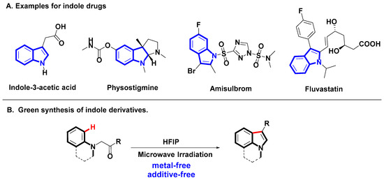 Indole is an important structural unit that is present in many natural alkaloids [1,2,3]. Indole derivatives, such as indole-3-acetic acid (IAA) [4], physostigmine [5], amisulbrom [6], and fluvastatin [7], possess a large range of biological activities (Scheme 1A). The development of efficient and simple synthetic methods for indoles is highly desired [8,9,10]. The classical name reactions, such as Bischler indole synthesis [11,12], Fischer indole synthesis [13,14], Bartoli indole synthesis [15,16], have been widely used for indole synthesis. In recent years, efforts have been devoted to improve the Bischler indole synthesis [17,18,19,20,21,22,23]. Metal catalysts, including Rh [17], Ir [18], Ru [19], and Zn [20], have been applied to such transformations. However, most of these metal reagents are expensive, and the metal pollution is an inevitable problem in the preparation of indoles. α-Amino arylacetone, being used for indole synthesis, has multiple reactive sites [24,25,26]. In the presence of a metal catalyst, α-amino arylacetone was transformed into indolone [24] or a-ketoamide [25], and even underwent the cleavage of the C-N bond [26]. Thus, the development of metal-free and mild conditions for the selective transformation of α-amino arylacetone is highly desired. Chen and co-workers reported that NH4PF6 could promote the Bischler indole synthesis under metal-free conditions [27]. However, the preparation of NH4PF6 requires the use of corrosive NH4F and PCl5, which are harmful to the environment. We envision that a protic solvent would be able to promote the cyclodehydration of α-amino carbonyl compounds at the assistance of microwave irradiation. Because microwave synthetic technology often greatly improves the reaction efficiency and shortens the reaction time [28,29,30]. Herein we report a HFIP-promoted Bischler indole synthesis under microwave irradiation in the absence of any additive (Scheme 1B).