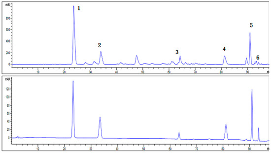 | Peak No. | Retention Time (min) | Compounds | Content in Sample (mg/g) |
