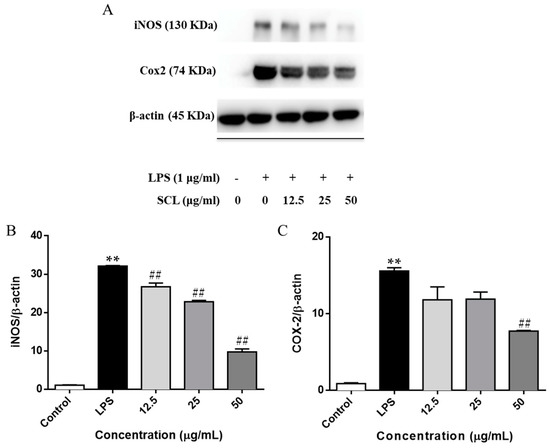 2.3. SCL Reduced the Expression of iNOS and COX-2 in LPS-Stimulated RAW264.7 Cells
