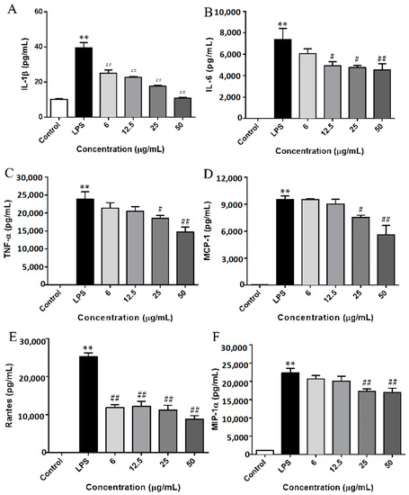 2.4. SCL Repressed the Production of Cytokines and Chemokines in LPS-Stimulated RAW264.7 Cells
