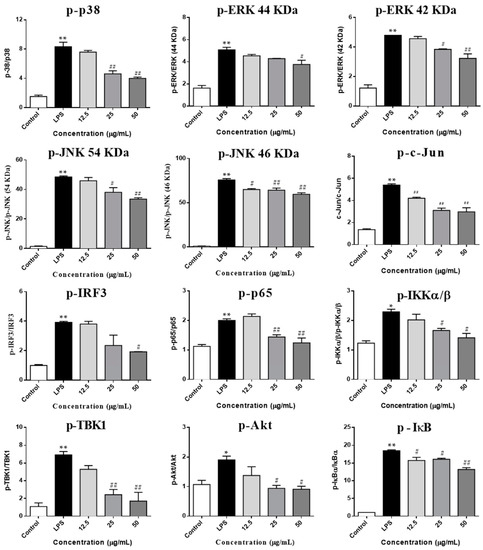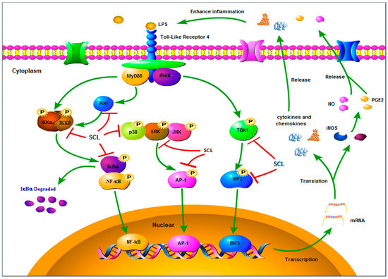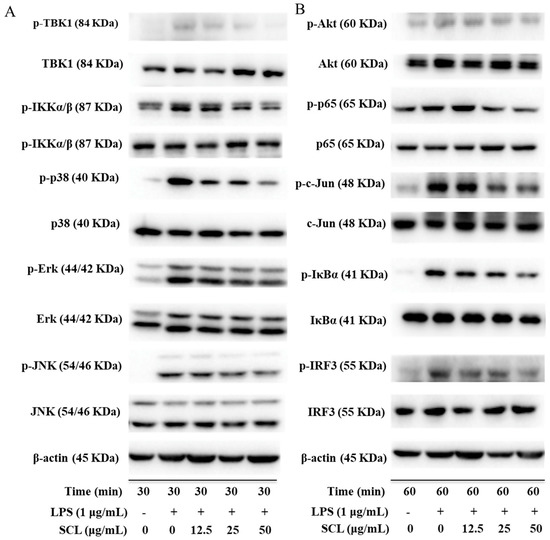 2.5. SCL Regulated on the Components of IKKα/β/NF-κB, MAPKs/AP-1 and TBK1/IRF3 Signaling Pathways