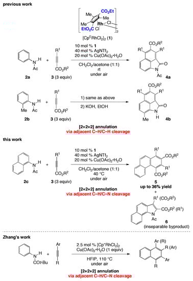 The transition-metal-catalyzed [2+2+2] annulation of three unsaturated compounds is a useful method for the synthesis of six-membered carbocycles and heterocycles [1,2,3,4,5,6,7,8,9]. For example, the transition-metal-catalyzed [2+2+2] annulation of three alkynes is able to afford densely substituted benzenes with an atom- and step-economical manner [10,11,12,13,14]. For the synthesis of naphthalene derivatives, benzynes have been employed as one of the three alkynes but the use of the benzynes suffers from the redundant precursor synthesis and harsh reaction conditions [15,16,17]. Alternatively, several examples of the transition-metal-catalyzed oxidative [2+2+2] annulation via cleavage of adjacent two C–H bonds of benzenes, in which formally dehydrogenated benzenes are employed as benzyne equivalents, have been reported [18,19,20,21,22]. As such, our research group reported that an electron-deficient cationic CpE-rhodium(III) complex, derived from 1, catalyzes the oxidative tandem [2+2+2] annulation-lactamization of acetanilide (2a) with two alkynoates 3 via cleavage of adjacent two C–H bonds at room temperature under air to give densely substituted banzo[cd]indolones 4a (Scheme 1, top) [23]. In this catalysis, not only acetanilide (2a) but also ortho-substituted acetanilide 2b was able to react with two alkynoates 3 to give the corresponding banzo[cd]indolones 4b after treatment with KOH in ethanol (Scheme 1, top) [23]. In this paper, we have established that the electron-deficient cationic CpE-rhodium(III) complex is able to catalyze the non-oxidative [2+2+2] annulation of N-(1-naphthyl)acetamide (2c) with two alkynoates 3 via cleavage of the adjacent C–H and C–N bonds, leading to densely substituted phenanthrenes 5, under mild conditions (at 40 °C under air) (Scheme 1, middle). Although several examples of the transition-metal-catalyzed decarboxylative and oxidative [2+2+2] annulation of benzoic acids with two alkynoates via cleavage of the adjacent C–H and C–C bonds, leading to densely substituted naphthalenes, have been reported [24,25,26,27], only a single example of the non-oxidative [2+2+2] annulation via cleavage of the adjacent C–H and C–N bonds, in which the acylamino moiety is employed as a traceless directing group, has been reported in the neutral Cp*-rhodium(III) complex-catalyzed synthesis of tetraarylnaphthalenes from N-acylanilines and two diarylacetylenes at elevated temperature (110 °C) (Scheme 1, bottom) [28].