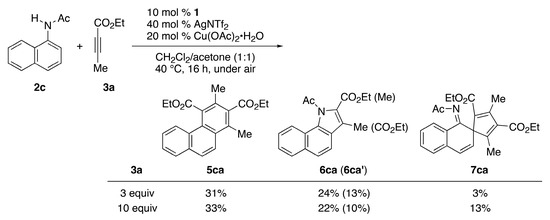 In the course of our study of the cationic CpE-rhodium(III) complex-catalyzed oxidative tandem [2+2+2] annulation-lactamization of acetanilides with two alkynoates, leading to banzo[cd]indolones, the reaction of 2-methyl acetanilide 2b and ethyl 2-butynoates (3a) was examined. As already shown in Scheme 1, the expected banzo[cd]indolones 4b were generated after treatment with KOH in ethanol [23]. Surprisingly, the use of N-(1-naphthyl)acetamide (2c) in place of 2b failed to afford the expected naphtho[cd]indolone 4ca. Instead, densely substituted phenanthrene 5ca was generated as a major product along with a mixture of the corresponding regioisomeric [3+2] annulation products 6ca/6ca′ (Scheme 2). In addition to the above products, unidentified oligomerization products derived from 2c and 3a were generated as by-products.