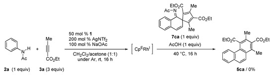 We considered that it is possible to regenerate spiro rhodacycle E by oxidative addition with a neutral rhodium(I) complex and protonation of 7ca. Therefore, 7ca was treated with acetic acid and an in situ generated neutral CpE-rhodium(I) complex, prepared by the reaction of 1, AgNTf2, NaOAc, 2a and 3a. However, no reaction was observed, thus excluding the intermediacy of 7ca in the catalytic cycle (Scheme 5).