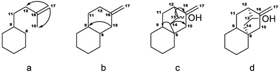 The aglycone signals were similar to those reported for steviol aglycone in compounds 1 and 2 except for δH 2.51 and δH 4.04 but signals were in good agreement with those reported for a similar aglycone previously found in Stevia eupatoria (Spreng.) Willd. and reported as 12-α-hydroxy-ent-kaur-16-en-19-oic acid based on the 1H- and 13C-NMR data together with chemical modifications [12]. Additionally, a triglucopyranosyl derivative isolated from S. rebaudiana (stevioside isomer) was also reported and was suggested a similar aglycone 12-α-hydroxy-ent-kaur-16-en-19-oic acid by comparison with previously reported data [13]. More recent NMR techniques allowed us to assign the aglycone as 13(S)-hydroxyastinoic acid. This type of aglycone was previously reported by converting microbiologically diterpene acids from Helianthus sp. with Gibberella fujikuroi [14]. The structure of the aglycone in 3 was inferred as described in Figure 2. The COSY spectrum reveals the sequence H-9–H-11ab–H-12. The coupling of H-17 with C-12 and C-15, seen in the HMBC spectrum, set fragment a. Coupling of H-15 with both C-8 and C-9 indicated that C-15 is bonded to C-8, as in fragment b. Couplings between the proton on the carbon carrying the oxygen (H-13, 4.04 ppm) with H-12 and H-14 were seen in the COSY spectrum, so they are vicinal, also corroborated for the HMBC correlation between H-13 and C-16. Protons in position 14 were identified by their coupling with H-13. They couple with C-8, C-9 and C-15, and therefore C-14 is bonded to C-8, as in fragment c. H-9 displayed a large coupling with C-14 and C-15, and the stereochemistry of fragment d was inferred. The stereochemistry of C-13 was assigned as S because of the large coupling of H-13 with C-16. The assignment of the diastereotopic protons was based on the large couplings between H-14 pro-R and C9, H-14 pro-S and C-15, H-15 pro-S and C-9, H-15 pro-R and C-14, H-11 pro-S and C-16, H-11 pro-R and C-13. A ROESY spectrum of compound 4, in which the chemical shifts of the aglycone are very similar to those in 3, confirmed this stereochemistry and these assignments, as it displayed nOes of H-20 with H-13 and H-14 pro-R, and of H-14 pro-R and H-11 pro-R.