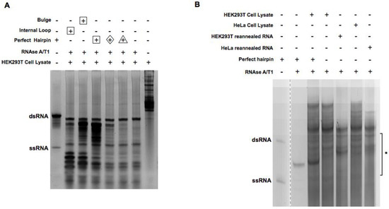Digestion of cell lysate and reannealed RNA with RNAse A/T1. (A) HEK293T cell lysate spiked with different kinds of RNA duplex oligos were digested with 1:200 dilution of RNAse A/T1 at 37 °C for 30 min. RNA was extracted after digestion and separated on 15% acrylamide TBE native gels and stained with SYBR gold. Lanes with different amounts of spike-in RNA were labeled with different shapes (Δ, 0.1 μg; ◊, 0.5 μg; ☐, 5 μg). The arrow indicates the band that was subject to more detailed investigation as described in Section 2.3. (B) Cell lysate and reannealed RNA with or without spiked-in were digested with 1:200 dilution of RNAse A/T1. * indicates where the bands were cut for cloning and sequencing.