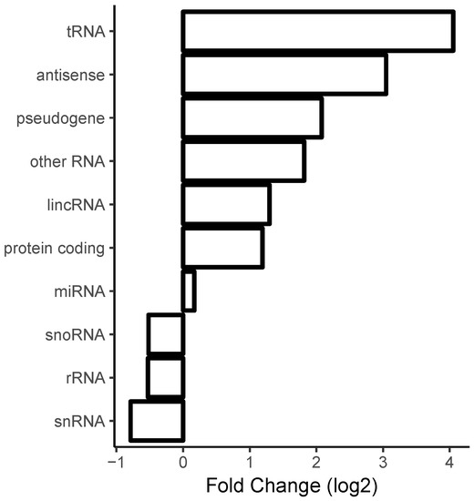 We computed, for each gene, the differential expression (i.e., fold-changes) with respect to a particular treatment using (as described in Section 4) the alignment program Salmon followed by differential gene expression analysis via the R package DESeq2. Next, we averaged the values by RNA type (using a simplified version of the RNA type classification provided by ENSEMBL, see Section 4). The averaged fold-change values of the protein-removed datasets versus the lysate datasets is shown in Figure 3. One can see that transfer RNA (tRNA), antisense, long intergenic non-coding RNA (lincRNA), and mRNA transcripts were overrepresented and ribosomal RNA was underrepresented in the datasets corresponding to removal of proteins with respect to datasets corresponding to native lysate.