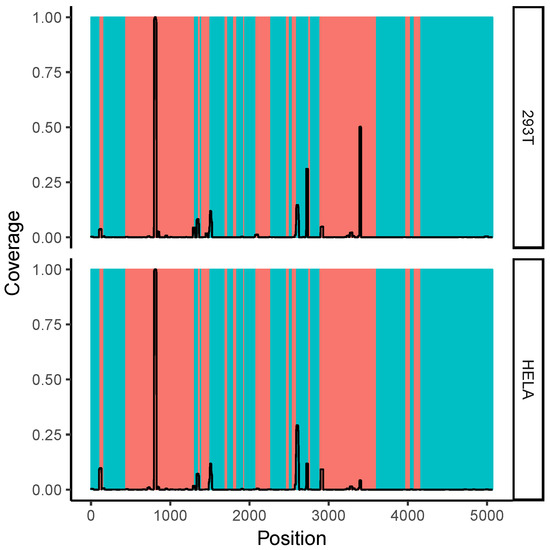 Read coverage with respect to 28S ribosomal RNA. Regions with orange background correspond to ribosomal expansion regions. One can see that regions with high read coverage are located within or adjacent to expansion regions. The shown data correspond to gel extraction of 293T cells or Hela cells (datasets S14 and S15 as listed in Table S1, Supplementary Materials). The coverage values were normalized such that, for each dataset, their highest coverage value on the 28S ribosomal RNA (rRNA) sequence was 1.0.