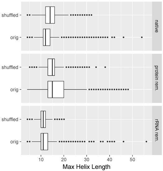 We searched computationally in an all-versus-all manner for candidate read pairs of RNA–RNA duplex formation as described in Section 4. In Figure 5, we plotted, for each read, the longest helix that was found when running the structure prediction program (RNAduplex) with respect to all other reads of the same length within the same dataset. One can see that the majority of the longest found helices were for the dataset corresponding to native lysates mostly shorter than 14 base pairs long, and were virtually never longer than 18 base pairs with the exception of outliers (Figure 5, native/orig). Importantly, the median of the lengths of the longest found helices was increased when the read sequences were shuffled prior to performing the interaction prediction (Figure 5, native/shuffled). This restriction in maximum length of detected potential RNA helices was, to a large extent, lifted in the case of the protein-removed datasets; with the exception of outliers, the maximum lengths of found helices was now 30 base pairs. Furthermore, comparison with shuffled sequences (Figure 5, protein rem./shuffled) suggests that this value of 30 base pairs is greater than what one would expect by chance. For both the protein-removed and ribosome-removed datasets, there was no pronounced difference in the median of predicted helix lengths between their respective shuffled and unshuffled versions.