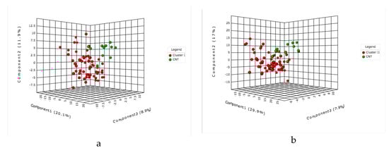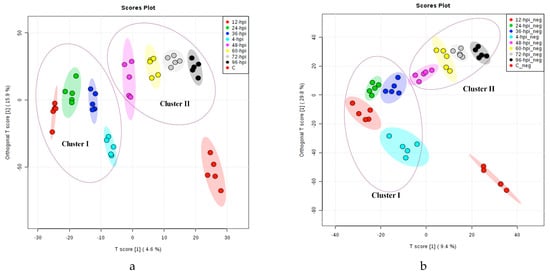 Secondly, multivariate analysis of OPLS-DA was then applied, and it revealed significant differences between the control and early- and late-infected asymptomatic plants, along with additional information regarding significant molecular features of the infection stages. In the OPLS-DA plots (Figure 1a,b), three different clusters in both the positive and negative ion modes corresponding to the initial control, early infection (4 to 36 hpi, cluster I) and late infection (48 to 96 hpi, cluster II) were delineated. Additionally, the heat map plots based on HCA showed additional information about the similarities between samples and clusters [41].