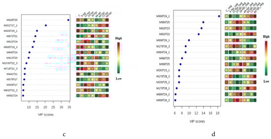 Subsequently, partial least squares-discriminant analysis (PLS-DA) that is a supervised chemometric method used to optimize the separation between different groups [40], was applied to investigate specific metabolic changes in the early asymptomatic infection stage. In Figure S7a,b, the differentiation of the infection times (4, 12, 24 and 36 hpi) based on metabolic profiles is now apparent. The VIP score-plots derived from PLS-DA (Figure 2a,b) can also discriminate other possible metabolites, such as the triterpene saponin (M798T23), the demissine (M529T12) (Figure 2a) and the triterpenoid saponin (M791T21) (Figure 2b), which increase at the early asymptomatic infection stage. For level of annotation see the Table S1.